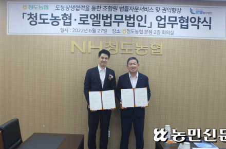 - 경북 청도농협(조합장 박영훈, 사진 오른쪽)이 6월27일 본점에서 조합원 법률서비스 지원과 권익 향상을 위해 로엘법무법인과 업무협약을 체결했다. 이번 업무협약에 따라 청도농협
